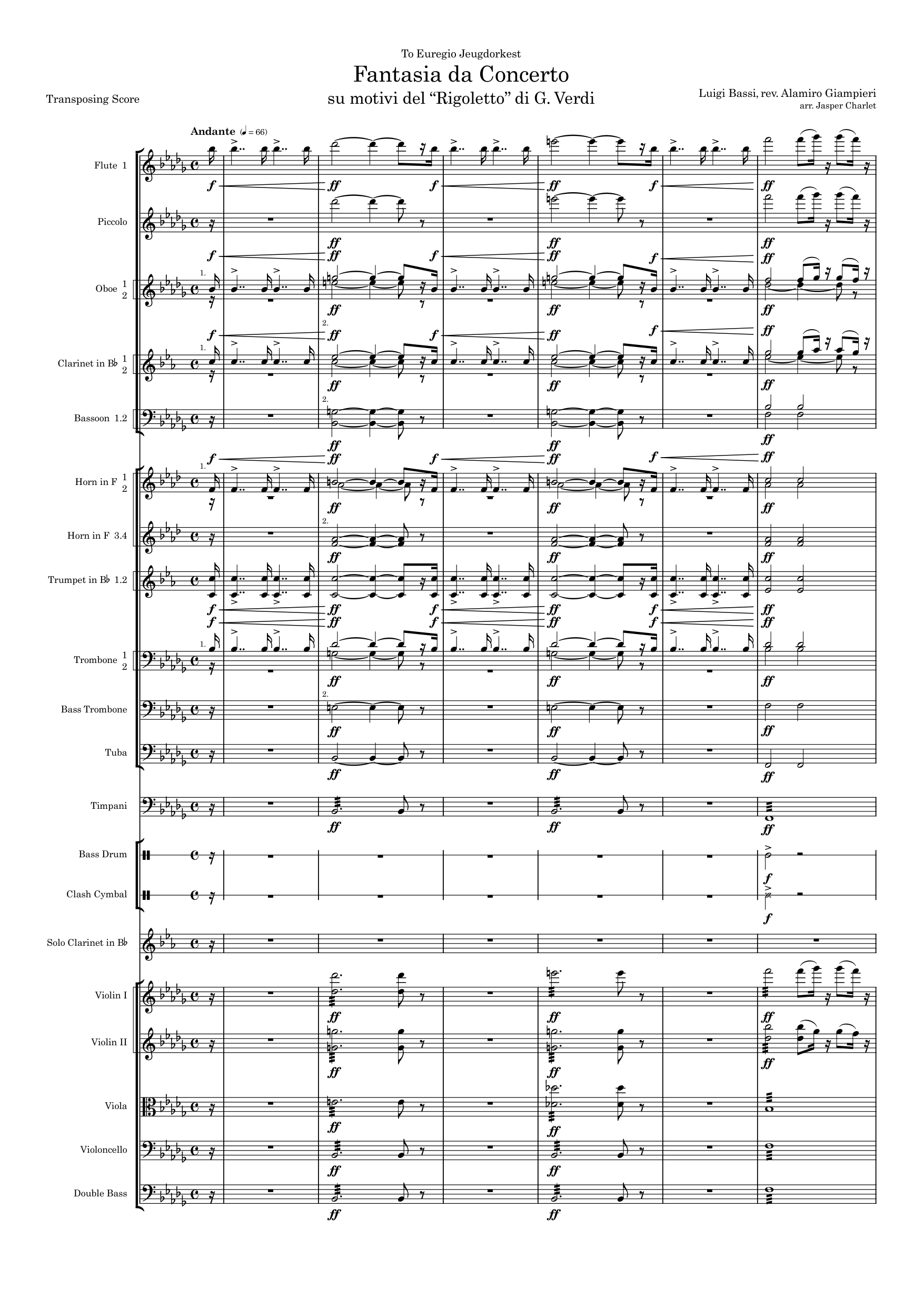 This orchestration of Luigi Bassi's Fantasia da Concerto su motivi del “Rigoletto” di G. Verdi was commissioned by the Euregio Youth Orchestra for their production A Night @ the Opera. It toured across Flanders and the Netherlands under the baton of Hans Casteleyn with Jeroen Vrancken as clarinet soloist. It was later performed in 2023 by the Leuven Alumni Orchestra with David Van Maele.