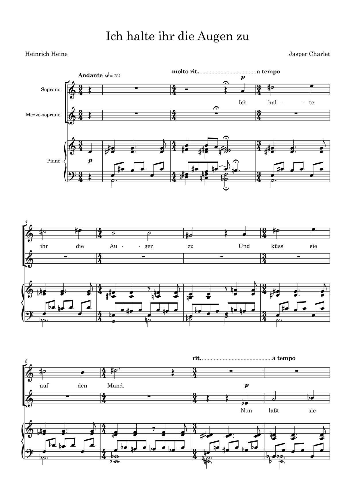 Based on a poem by Heinrich Heine, Ich halte dir die Augen zu is a short duet for soprano and mezzo-soprano (or contralto) with piano accompaniment. It was written for Kristien Doumen and Maria Eichler.